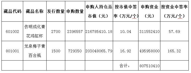 本次中簽分配方式按持倉市值優(yōu)先分配規(guī)則,請廣大參與申購的投資會員關(guān)注交易賬號中持倉數(shù)量和資金變化情況。《仿明成化青花雞缸杯》、《龍泉梅子青百合瓶》將于2016年9月26日正式掛牌交易。