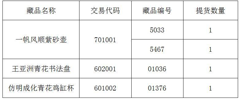 應(yīng)投資人會員申請,經(jīng)本交易所對申請人信息核實以及出庫藏品復(fù)驗后,提貨藏品已完成發(fā)貨,提醒廣大投資者注意盤面藏品數(shù)量變化。提貨藏品信息如下: