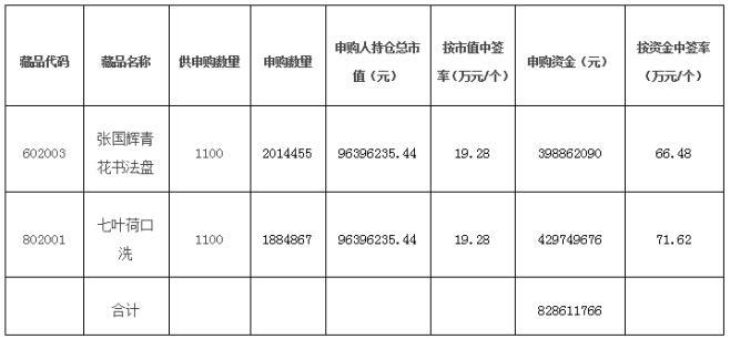 本次中簽分配方式為45.45%按持倉市值分配,54.55%按申購資金分配,請廣大參與申購的交易會員關注交易賬號中持倉數量和資金變化情況。《張國輝青花書法盤》、《七葉荷口洗》將于2017年4月8日正式掛牌交易。